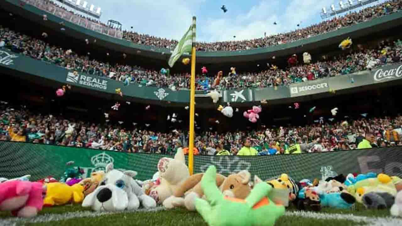Los hinchas lanzaron juguetes en el estadio del Betis de Sevilla para que ningún niño de la ciudad se quede sin regalo por Navidad, según reportaron los internautas en las redes. ¡Bonito gesto!