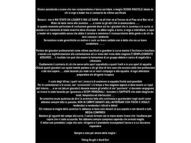 Il tifo organizzato ha commentato le difficoltà del momento, ma ha anche criticato il 19 bianconero: “Bonucci non è mai stato un leader e mai lo sarà”. Il riferimento è al comportamento che il difensore ha adottato dopo le recenti sconfitte, quando ha scelto di portare i compagni di squadra sotto alla curva per ricevere i fischi.