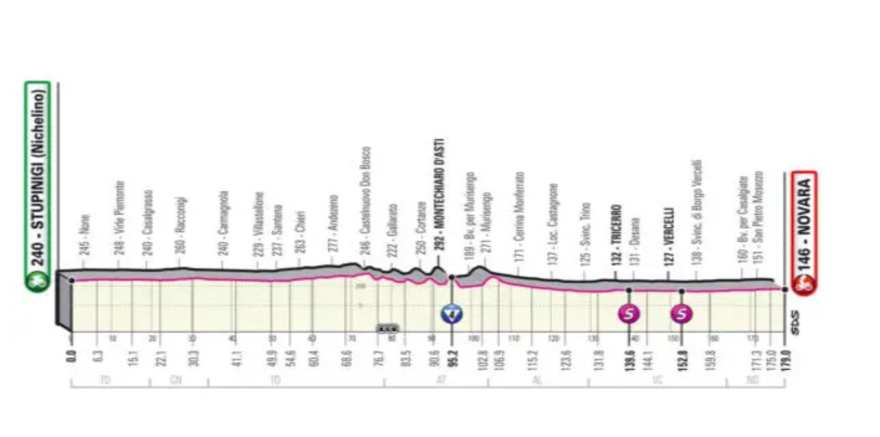 Il copione della tappa sembra già scritto: una lunga fuga iniziale con gli atleti della squadre che devono mettersi in mostra, come le Professional e il gruppo che lascia fare. L’unica insidia è il Gran Premio della Montagna di 4^ categoria a Montechiaro d’Asti, poco prima di metà percorso. Nel finale però tutti i favoriti e gli uomini di classifica dovranno fare attenzione al vento che soffia in mezzo alle risaie di vercellese e novarese.