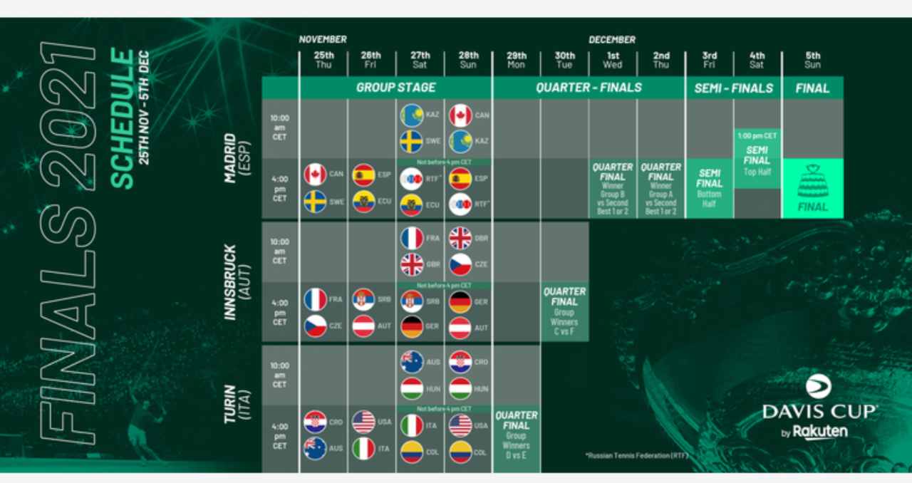Primo atto ufficiale delle Davis Cup by Rakuten Finals 2021, la nuova formula della coppa che ha debuttato nell’ultima edizione. La federazione internazionale infatti ha confermato il calendario completo delle partite che cominceranno il 25 novembre nelle tre sedi di Torino, Innsbruck e Madrid, la prima delle novità introdotte.