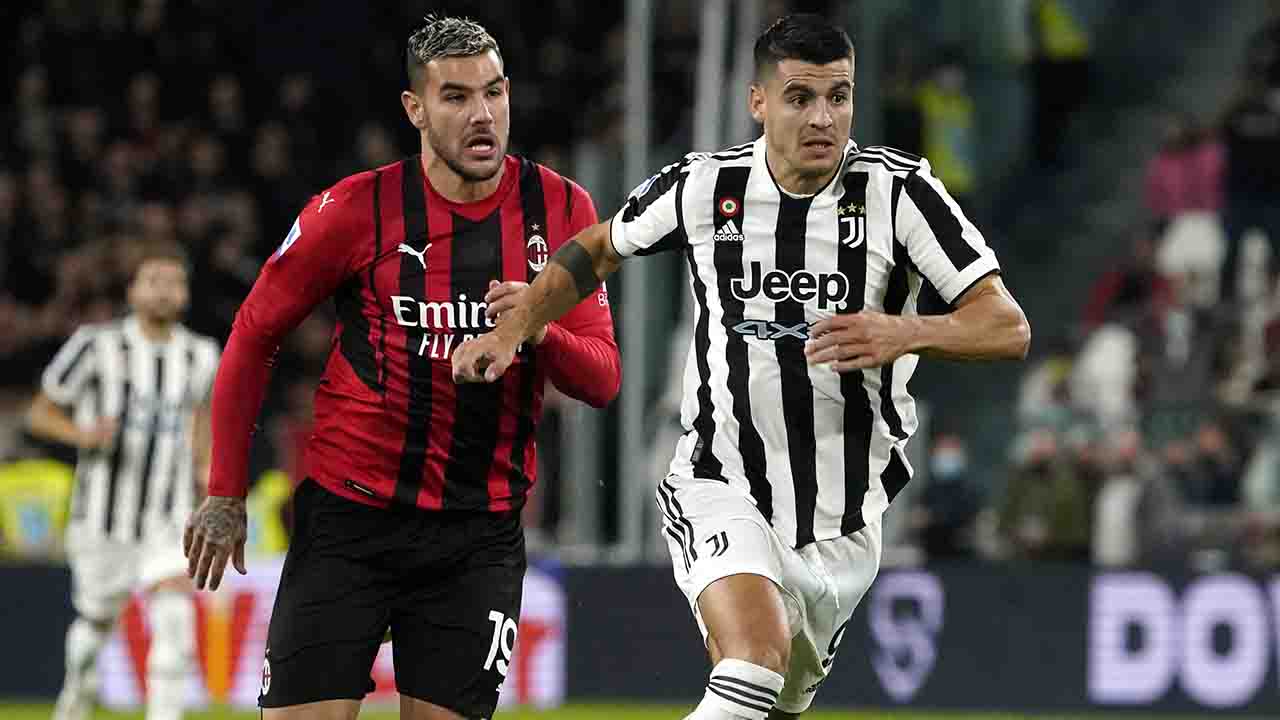 TURIN, ITALY - SEPTEMBER 19: Alvaro Morata of Juventus is challenged by Theo Hernandez of AC Milan during the Serie A match between Juventus and AC Milan at the Allianz Stadium in Turin, Italy on September 19, 2021 in Turin, Italy. (Photo by Pier Marco Tacca/Getty Images)