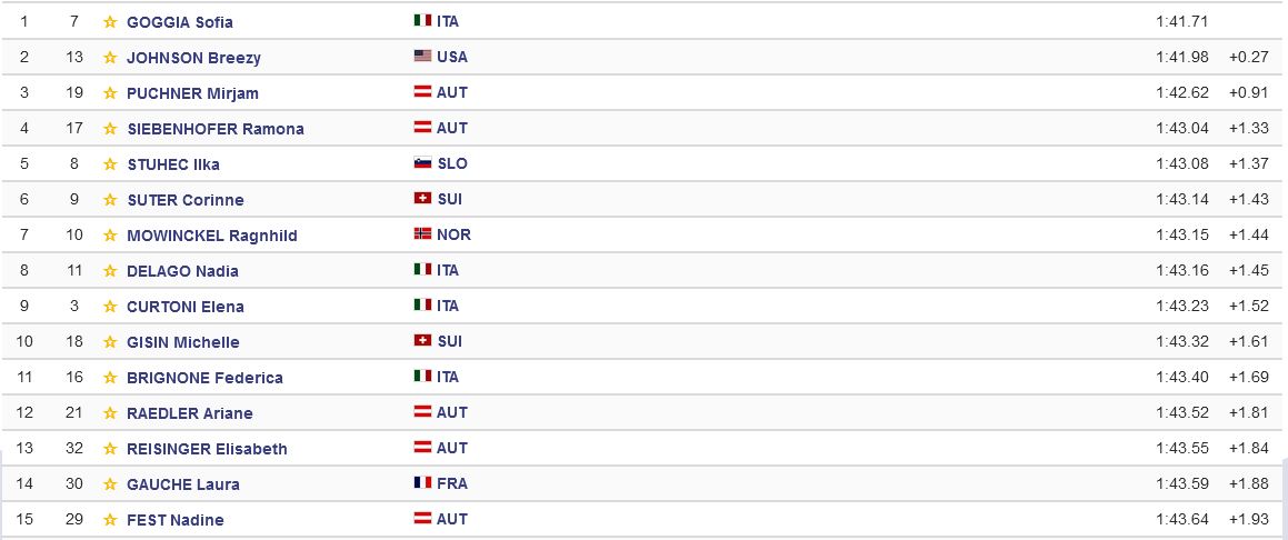 Di seguito la classifica della Discesa Libera di Val d’Isere con le prime quindici arrivate