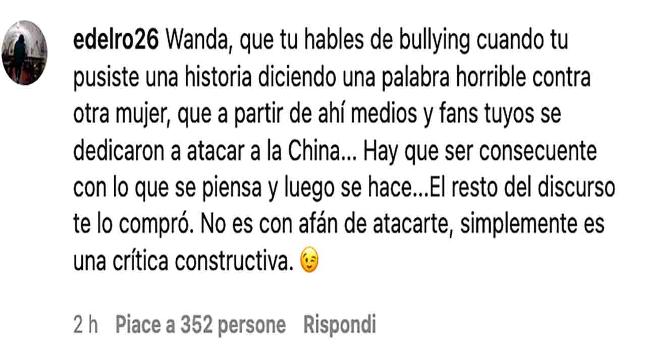 Un messaggio condivisibile da qualsiasi genitore sia rimasto sconvolto dalla notizia e dalle foto social pubblicate dalla famiglia Hardman. Che tuttavia, come ogni messaggio postato da Wanda Nara e dal marito, ha ricevuto un’accoglienza divisiva. Da una parte plausi e like (oltre 140mila in poche ore). Dall’altra sarcasmo e insulti. Tra i commenti c’è hi le chiede che razza di esempio sia lei. C’è chi vuole avere notizie della relazione extraconiugale di suo marito emersa alcune settimane fa e che mise in crisi il suo matrimonio, chi le dà semplicemente della poco di buono o della ipocrita.