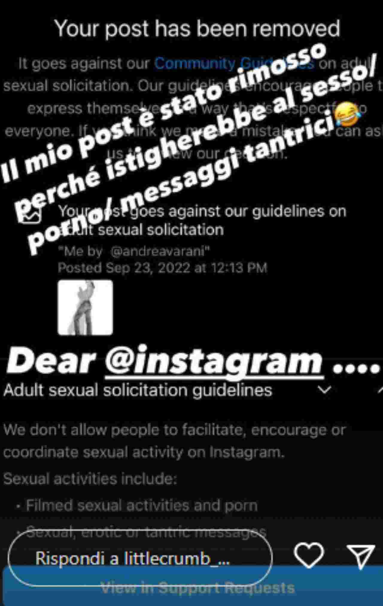 Il regolamento della piattaforma è chiaro: “Sappiamo che talvolta le persone desiderano condividere immagini di nudo artistiche o di natura creativa, ma per diversi motivi non è consentita la pubblicazione di contenuti di nudo su Instagram. Sono inclusi le foto, i video e altri contenuti creati con strumenti digitali che mostrano rapporti sessuali, genitali e primi piani di fondoschiena nudi. Sono comprese inoltre alcune foto con capezzoli femminili in vista. Anche se questi contenuti vengono condivisi con buone intenzioni, altre persone potrebbero usarli in modi imprevisti”.