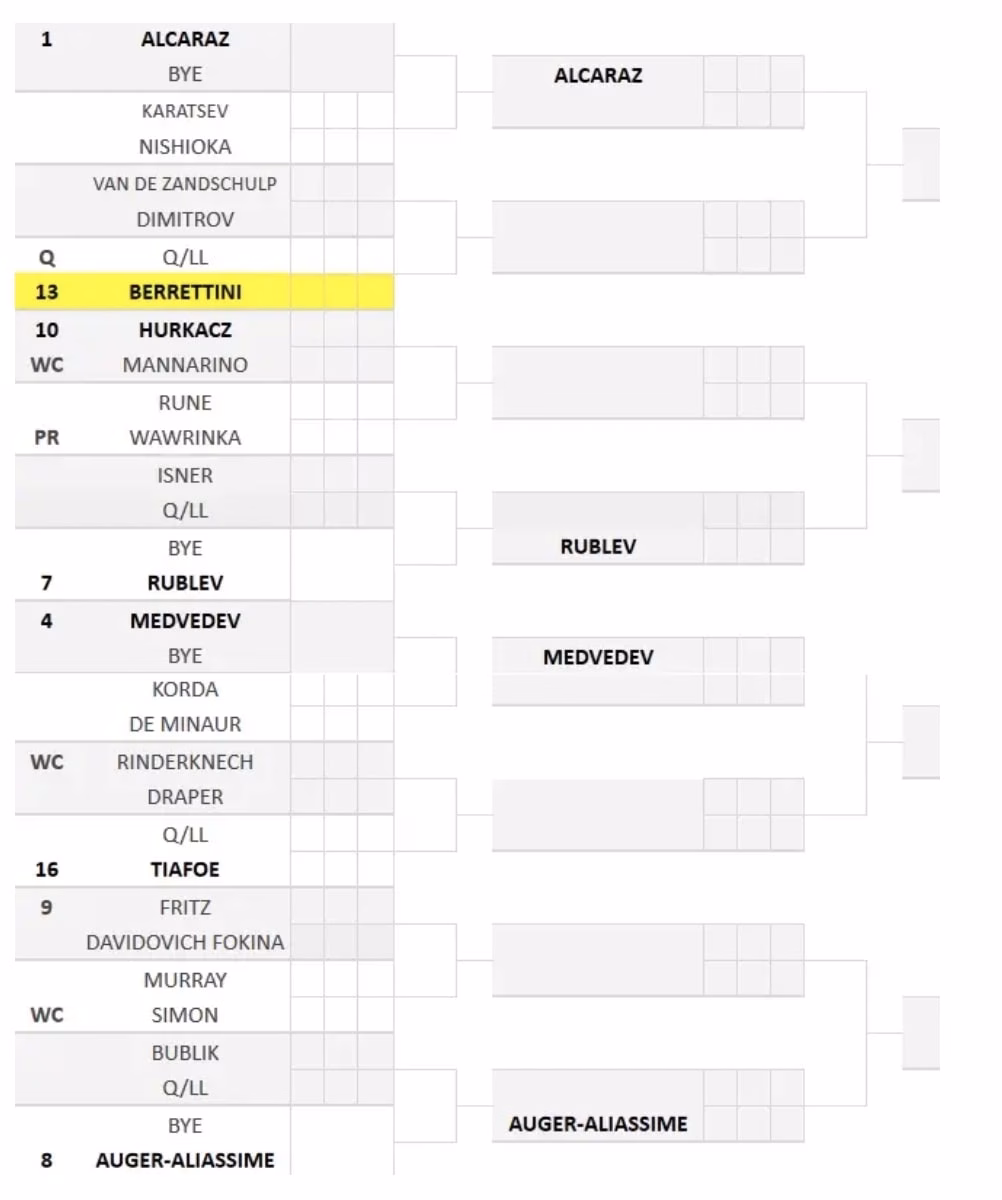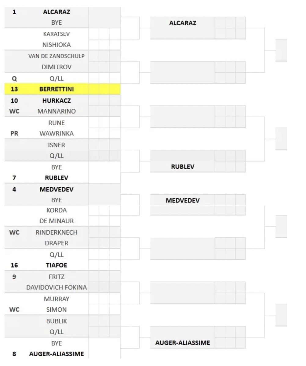 Berrettini e Alcaraz sono inseriti nel quarto di finale di Rublev. Nell’altra porzione della parte alta del main draw, invece, le principali teste di serie sono Medvedev (finalista un anno fa) e Auger Aliassime. Quest’ultimo con la finale raggiunta a Basilea è a un passo dalle Finals di Torino.