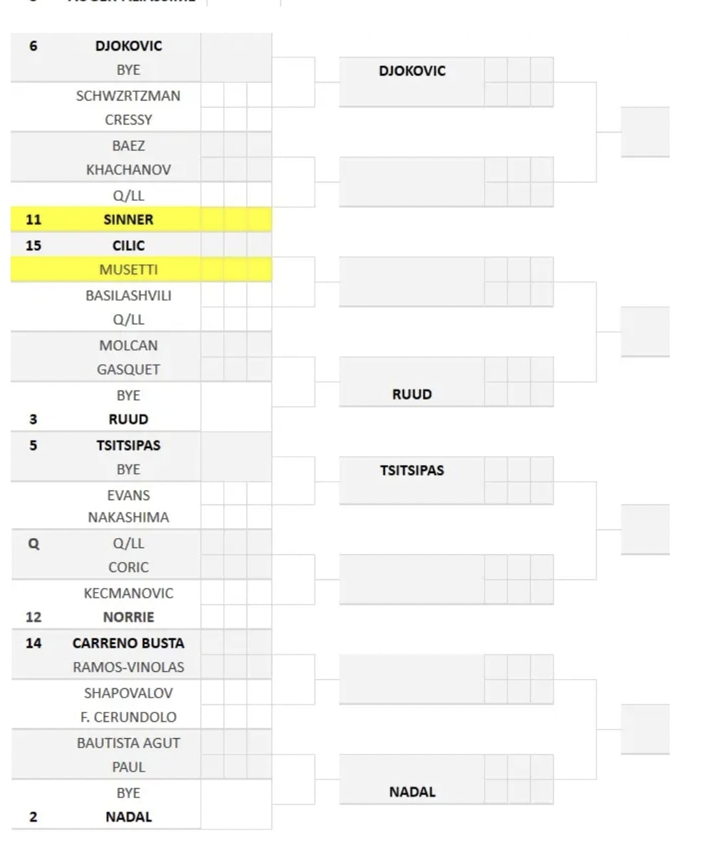 Il campione in carica di Bercy, Novak Djokovic è la sesta testa di serie del seeding parigino. Il serbo esordirà con Cressy o Schwawrtzman e agli ottavi potrebbe incrociare Sinner. Come Berrettini anche Jannik esordirà con un qualificato per poi incrociare, in caso di qualificazione, Baez o Khachanov. Sinner e Djokovic sono inseriti nel quarto di finale di Ruud, il quale agli ottavi potrebbe trovare Lorenzo Musetti, atteso all’esordio da un match impegnativo con Cilic.
