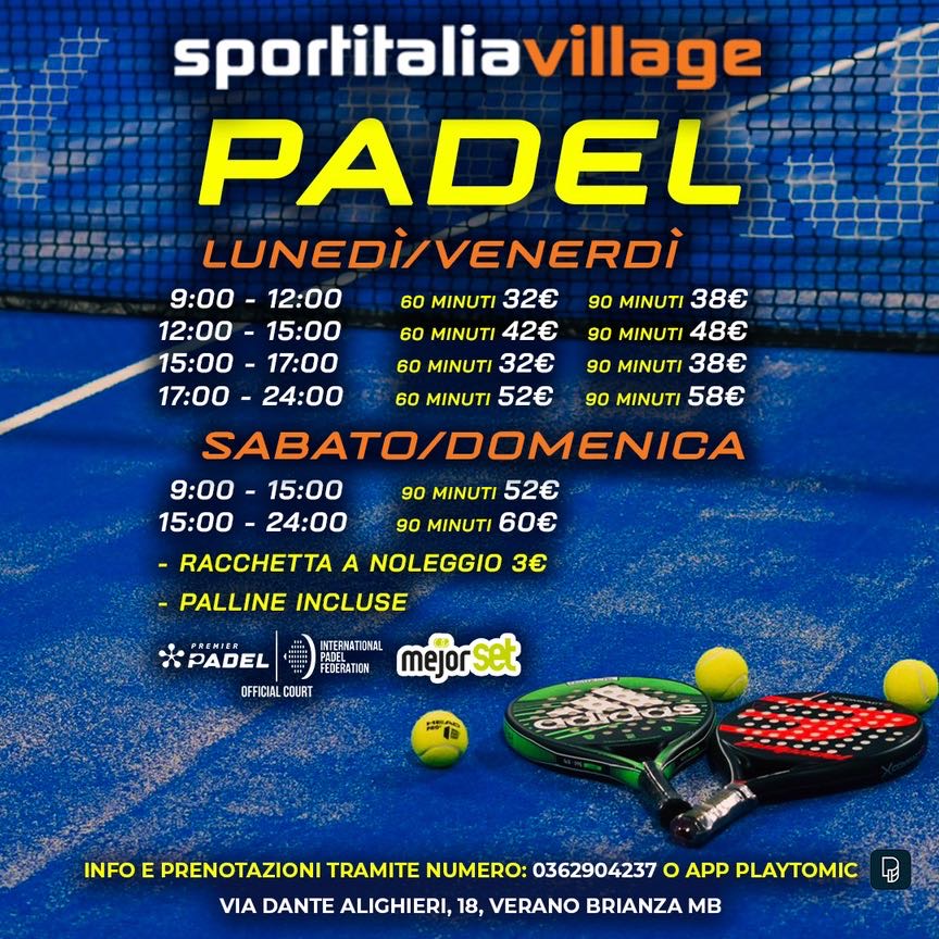 Novità importante per lo Sportitalia Village (via Dante Alighieri 18, Verano Brianza) che implementa le sue strutture con tre campi da Padel professionali per garantire la migliore esperienza per lo sport del momento. Sarà possibile effettuare prenotazioni in tutti i giorni della settimana nelle modalità e negli orari specificati dalla locandina. Sarà inoltre possibile noleggiare in loco anche la racchetta mentre le palline saranno incluse.