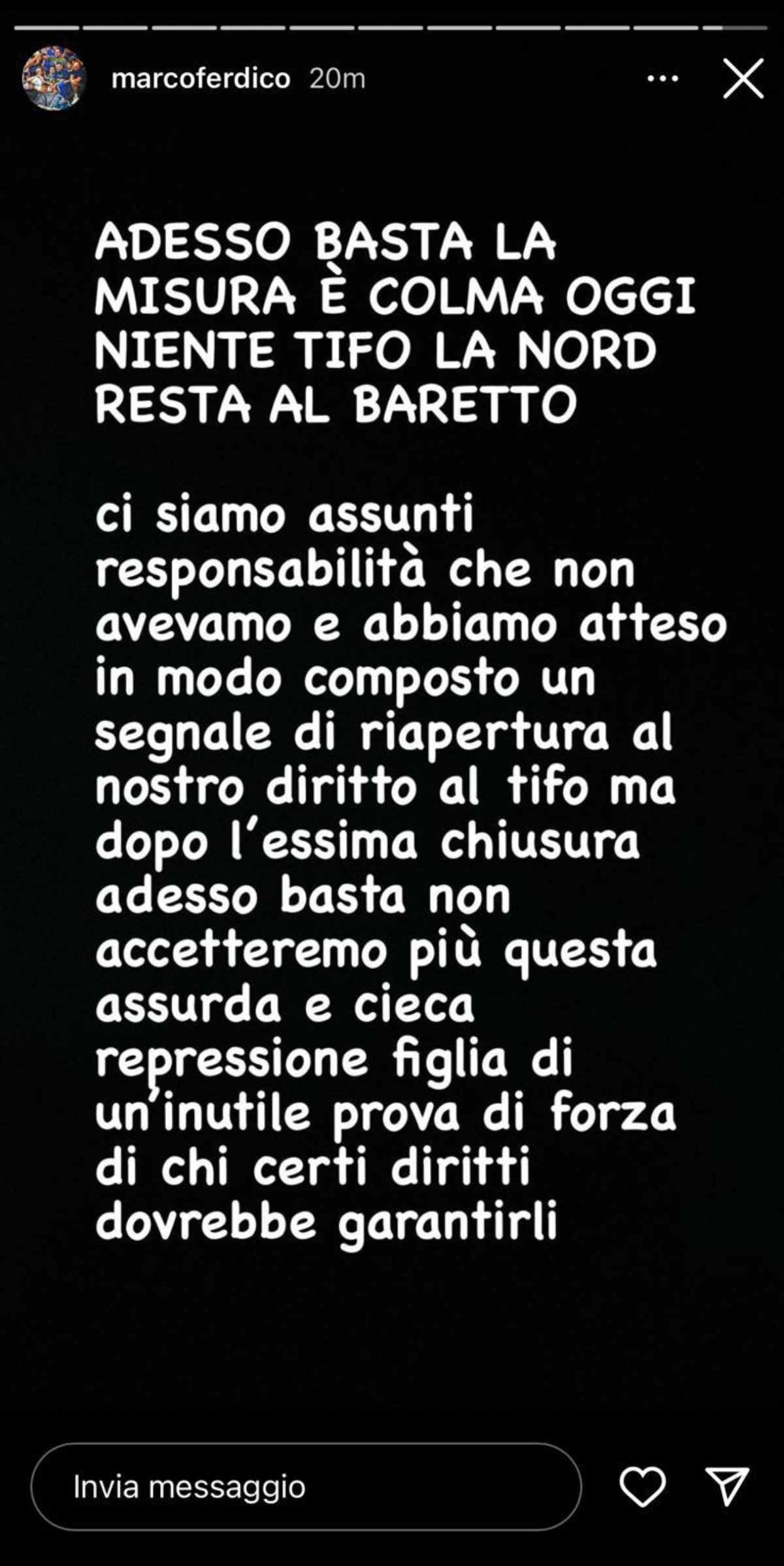 Con un breve post, pubblicato su Instagram, il responsabile della Curva Nord dell’Inter, Mario Ferdico, ha spiegato il motivo dell’assenza del popolo nerazzurro questa sera contro il Genoa nel posticipo della 27esima giornata.