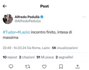 Home » Calcio » ESCLUSIVA SI, le novità per la panchina della LazioESCLUSIVA SI, le novità per la panchina della Lazio 14/03/2024 - 23:01 di Carlo Pozzoli Secondo quanto riportato dal nostro Alfredo Pedullà è terminato l’incontro tra Tudor e la Lazio. L’esito sarebbe positivo e l’intesa di massima è vicina. Ecco il post su Twitter: