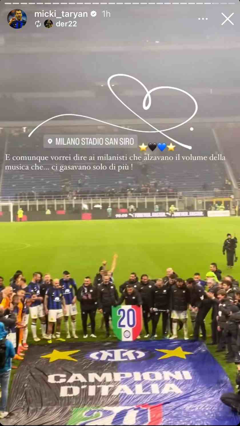 Home » Calcio » Mkhitaryan e la frecciata al Milan: “Ci gasavamo solo di più”Mkhitaryan e la frecciata al Milan: “Ci gasavamo solo di più” 24/04/2024 - 00:25 di Massimiliano Fina Instagram Stories di Henrikh Mkhitaryan, centrocampista dell’Inter dopo la vittoria nel derby e la conquista dello Scudetto.