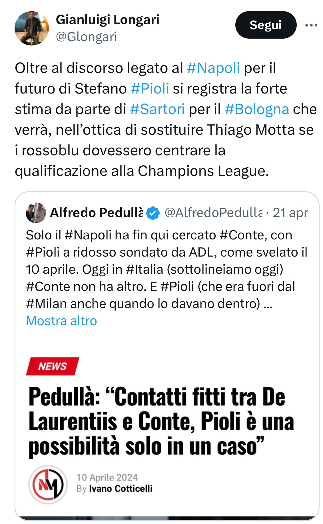 Non solo il Napoli, Stefano Pioli è corteggiato anche dal Bologna in caso di addio di Thiago Motta. Secondo quanto raccolto dal nostro Gianluigi Longari, si apre quindi la clamorosa possibilità di un ritorno del tecnico Emiliano nella squadra felsinea. Pioli infatti ha già allenato il Bologna dal 2011 al 2014, raccogliendo in 97 partite 32 vittorie, 28 pareggi e 37 sconfitte.