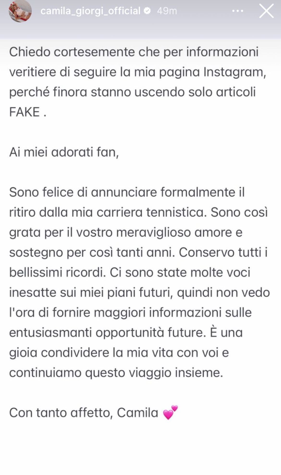 Camila Giorgi è riapparsa sui propri social e tramite una storia Instagram ha annunciato il ritiro dal Tennis. Smentendo le voci uscite sulla sua persona nelle ultime ore. Ecco il testo: “Chiedo cortesemente per informazioni veritiere di seguire la mia pagina Instagram, perché finora stanno uscendo solo articoli FAKE. Ai miei cari fan, Sono felice di annunciare formalmente il mio ritiro dalla carriera tennistica. Sono così grata per il vostro meraviglioso amore e sostegno per così tanti anni. Conservo tutti i bellissimi ricordi. Ci sono state molte voci inesatte sui miei piani futuri, quindi non vedo l’ora di fornire maggiori informazioni sulle entusiasmanti opportunità future. E’ una gioia condividere la mia vita con voi e continuiamo questo viaggio insieme. Con tanto affetto, Camilla“.