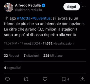 Secondo quanto riportato dal nostro Alfredo Pedullà, in casa Juventus, si lavora sempre di più per Thiago Motta come prossimo allenatore della formazione bianconera. Ecco i dettagli: Thiago Motta–Juventus: si lavora su un triennale più che su un biennale con opzione. Le cifre che girano (3,5 milioni a stagioni) sono un po’ al ribasso rispetto alla verità.