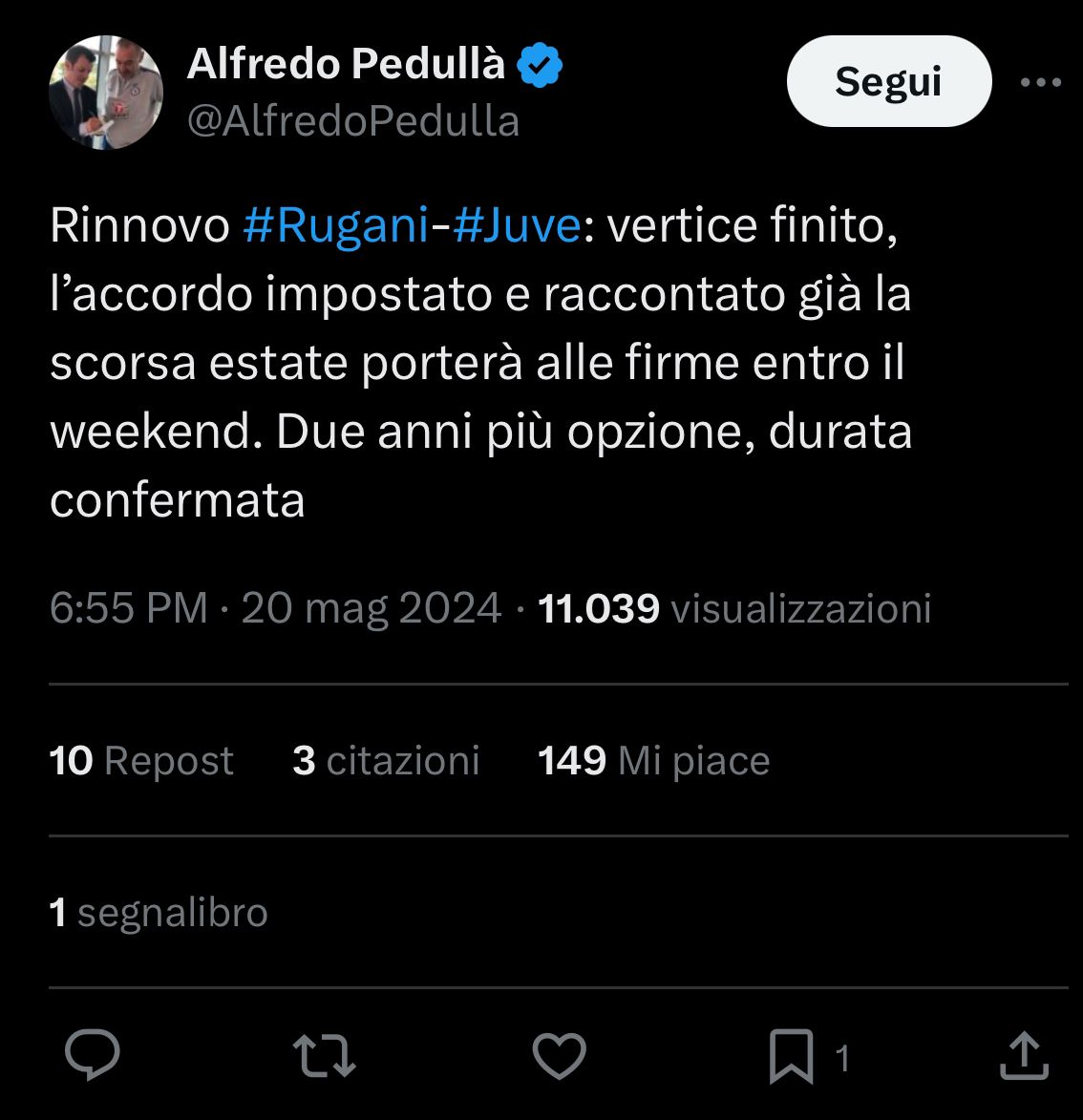 Rinnovo Rugani–Juve: vertice finito, l’accordo impostato e raccontato già la scorsa estate porterà alle firme entro il weekend. Due anni più opzione, durata confermata. Così scrive in esclusiva il nostro Alfredo Pedullà sul suo profilo X. Ecco il tweet: