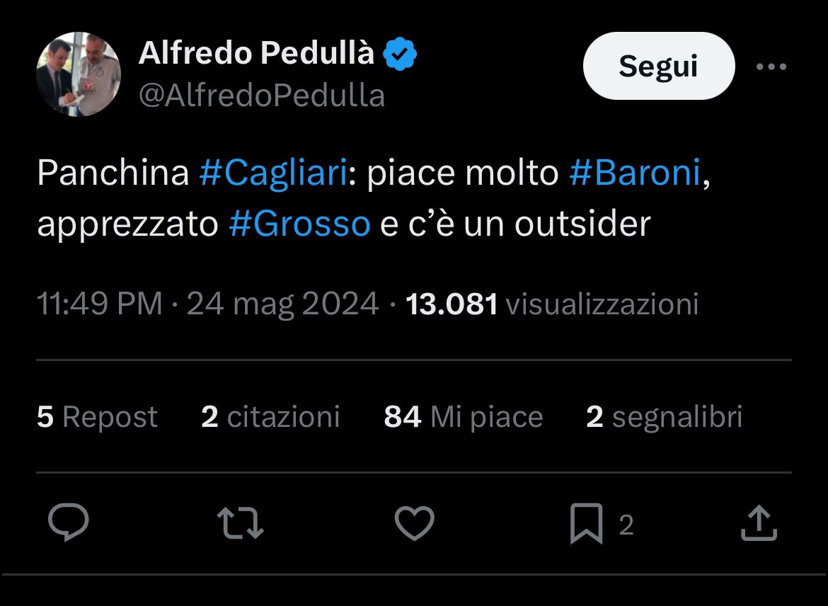 Secondo quanto riportato in esclusiva dal nostro Alfredo Pedullà, sarebbe Marco Baroni, attuale allenatore dell’Hellas Verona, il principale candidato per la panchina del Cagliari nel post-Ranieri. Prima alternativa è poi Fabio Grosso.
