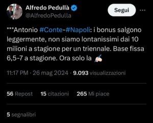 E’ sempre più vicino l’approdo di Antonio Conte al Napoli. Secondo quanto riportato in esclusiva dal nostro Alfredo Pedullà, infatti, manca oramai quasi solo la firma per il tecnico ex di Juventus e Inter con gli azzurri. Un accordo triennale con bonus che salgono leggermente arrivando non lontanissimi dal 10 milioni. La base fissa sarà di 6,5-7 milioni annui. Ecco il tweet:
