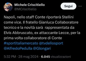 Secondo quanto riportato, in esclusiva, dal nostro Direttore Michele Criscitiello, Antonio Conte avrebbe scelto il suo staff. Il tecnico riporterà Stellini come vice. Il fratello Gianluca sarà Collaboratore tecnico e la novità sarà rappresentata da Elvis Abbruscato, ex attaccante Lecce, per la prima volta collaboratore di Conte.