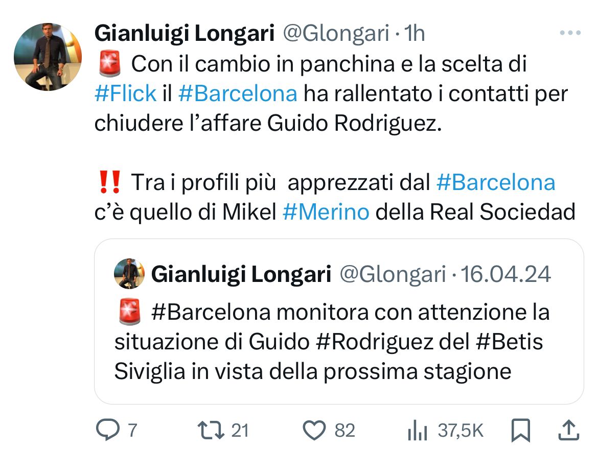 Secondo quanto riportato in esclusiva dal nostro Gianluigi Longari, il nuovo tecnico del Barcellona, Flick, avrebbe bocciato l’acquisto di Guido Rodriguez bloccando l’operazione. Ecco la notizia: “Con il cambio in panchina e la scelta di Flick il Barcelona ha rallentato i contatti per chiudere l’affare Guido Rodriguez. Tra i profili più apprezzati dal Barcelona c’è quello di Mikel Merino della Real Sociedad”. Ecco il tweet: