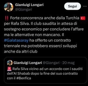 Secondo quanto riportato in esclusiva dal nostro Gianluigi Longari c’è forte concorrenza anche dalla Turchia per Rafa Silva. Il club saudita in attesa di sostegno economico per concludere l’affare ma le alternative non mancano. Il Galatasaray ha offerto un contratto triennale ma potrebbero esserci sviluppi anche da altri club. Ecco il tweet: