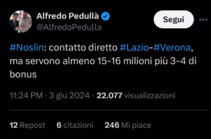 Secondo quanto riportato in esclusiva dal nostro Alfredo Pedullà la Lazio avrebbe messo nel mirino Tijani Noslin, attaccante del Verona. Arrivato a gennaio all’Hellas a ben impressionato segnando 5 gol in 17 presenze contro Juventus, Milan, Atalanta, Fiorentina e Inter servendo anche 4 assist. La valutazione è di circa 15-16 milioni più 3-4 di bonus. Ecco il Tweet: