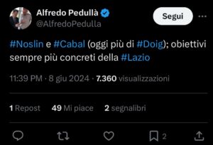 Secondo quanto riportato dal nostro Alfredo Pedullà, la Lazio sarebbe interessata a due calciatori dell’Hellas Verona. I nomi sono quelli di Noslin e Cabal (preferito a Doig). I biancocelesti dovrebbero ufficializzare a breve Marco Baroni come nuovo allenatore che potrebbe così riabbracciare due suoi ex calciatori. Ecco il tweet: