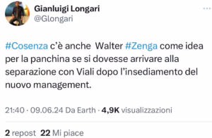 Secondo quanto riportato in esclusiva dal nostro Gianluigi Longari, c’è anche Walter Zenga come idea per la panchina del Cosenza se si dovesse concretizzare la separazione con Viali dopo l’insediamento del nuovo management. Ecco il tweet: