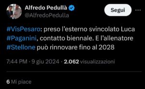 Secondo quanto riportato in esclusiva dal nostro Alfredo Pedullà, la Vis Pesaro ha preso l’esterno Luca Paganini, svincolato dopo l’esperienza a Latina. Paganini firmerà un contratto biennale. Non solo Paganini perché la Vis Pesaro è vicina anche a rinnovare il contratto dell’allenatore Stellone fino al 2028. Ecco il tweet: