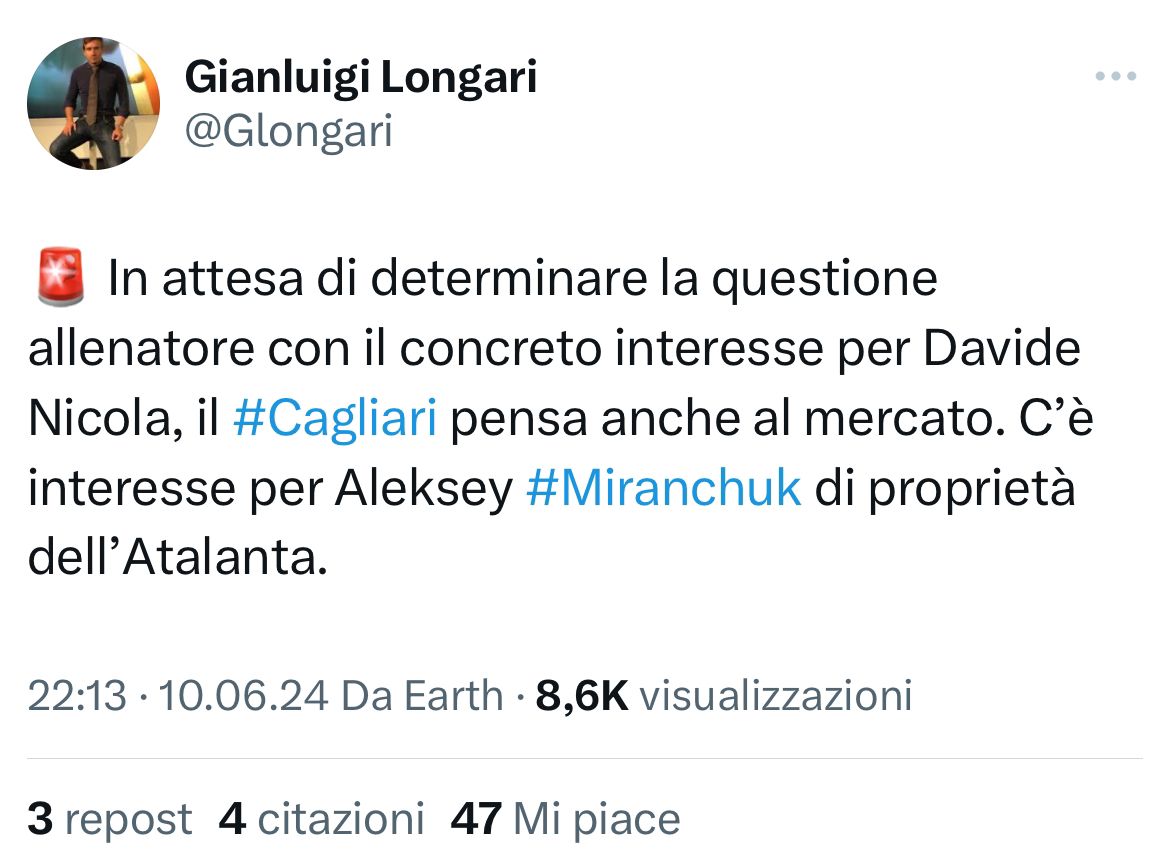 Secondo quanto riportato dal nostro Gianluigi Longari, il Cagliari non sta valutando soltanto Davide Nicola come prossimo allenatore. I sardi infatti stanno già pensando anche al mercato. Il primo nome sulla lista del Cagliari sarebbe quello di Aleksey Miranchuk, trequartista dell’Atalanta. Ecco il tweet:
