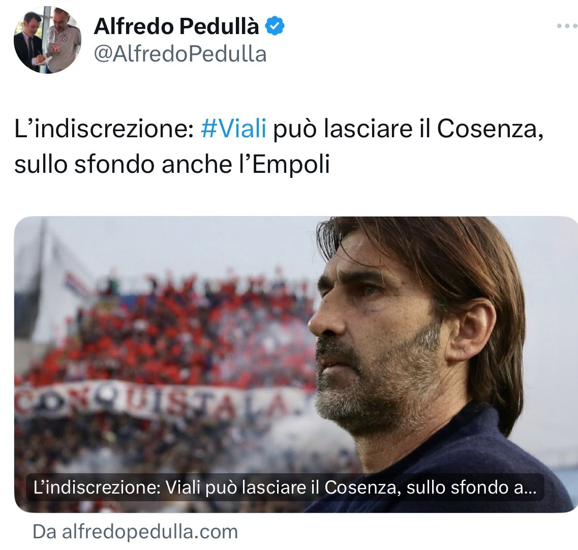 Secondo quanto riportato dal nostro Alfredo Pedullà, William Viali potrebbe lasciare il Cosenza: “William Viali ha un altro anno di contratto con il Cosenza, ma potrebbe lasciare anche se non ci sono certezze. Servirà un vertice con il nuovo management del club rossoblu (Ursino direttore generale, Delvecchio direttore sportivo), è una situazione in divenire aspettando che venga presa una decisione definitiva. Diversi club di Serie B hanno chiesto informazioni su Viali, sullo sfondo c’è anche l’Empoli se dovesse liberare Nicola per il Cagliari“. Ecco il tweet: