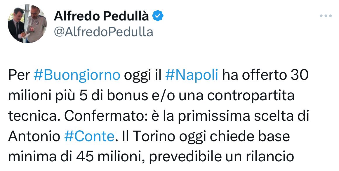 Secondo quanto riportato in esclusiva dal nostro Alfredo Pedullà, il Napoli si starebbe muovendo per Buongiorno del Torino. Gli azzurri hanno infatti offerto 30 milioni più 5 di bonus e/o una contropartita tecnica. E’ confermato come Buongiorno sia la primissima scelta di Conte. Il Torino oggi chiede base minima 45 milioni, prevedibile un rilancio azzurro. Ecco il tweet: