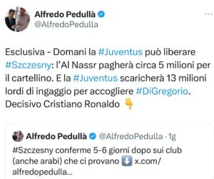 Secondo quanto riportato in esclusiva dal nostro Alfredo Pedullà, domani la Juventus può liberare Szczesny: l’Al Nassr pagherà circa 5 milioni per il cartellino. E la Juventus scaricherà 13 milioni lordi di ingaggio per accogliere Di Gregorio. Decisivo Cristiano Ronaldo. Ecco il tweet:
