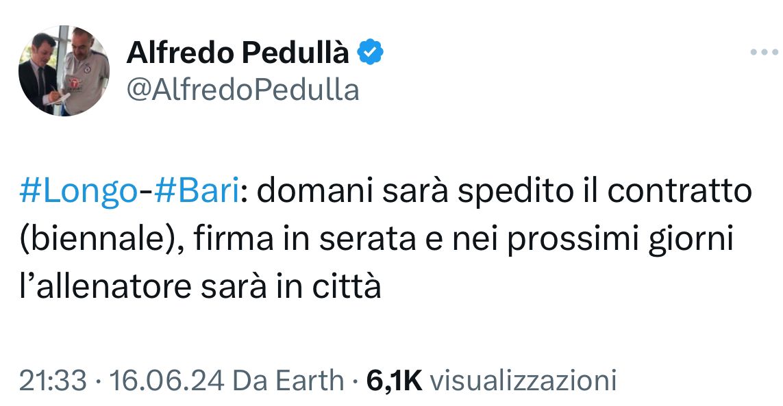 Longo-Bari, domani sarà spedito il contratto (biennale), firma in serata e nei prossimi giorni l’allenatore sarà in città. Cosi in esclusiva il nostro Alfredo Pedullà che annuncia quello che sarà il nuovo tecnico del Bari nella prossima stagione.