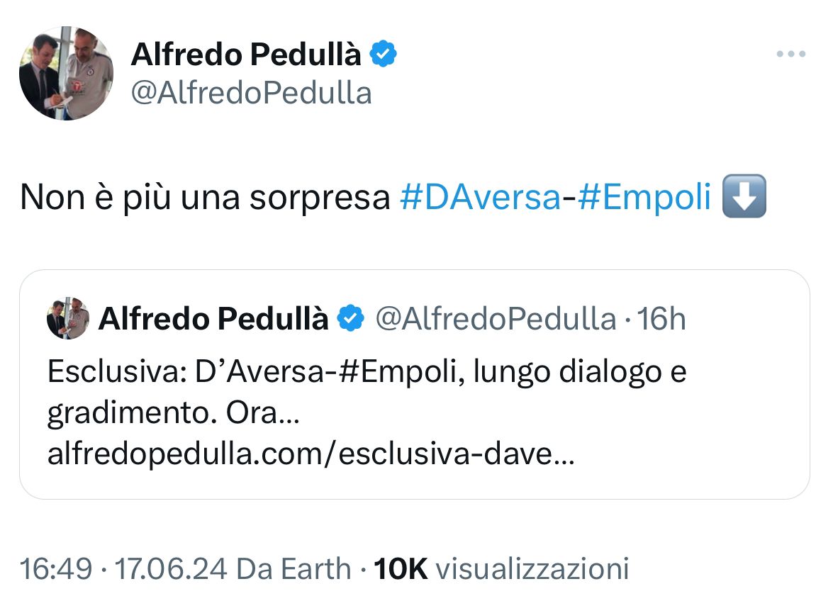 Come già anticipato nelle ultime ore dal nostro Alfredo Pedullà, in esclusiva, è fatta per l’arrivo di Roberto D’Aversa sulla panchina dell’Empoli. Salta quindi il trasferimento del tecnico al Cesena.