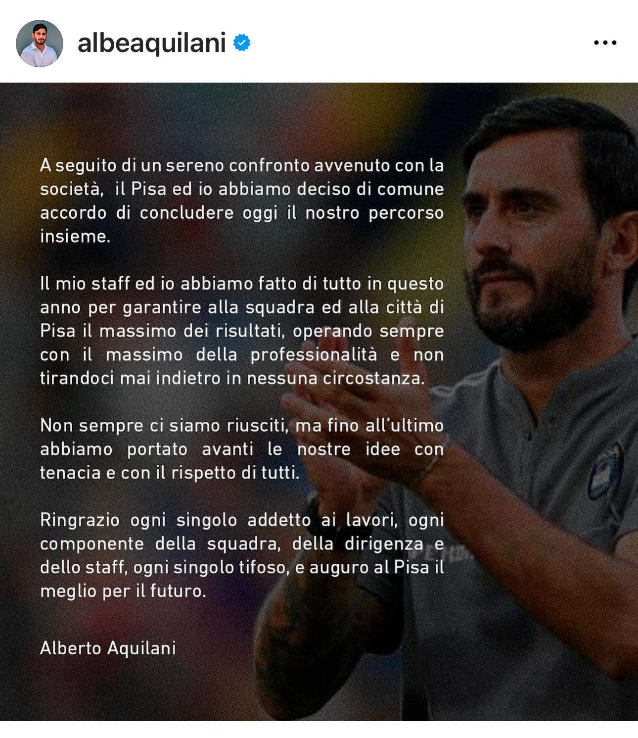 Pisa, si separano le strade con Mister Aquilani: l’annuncio
