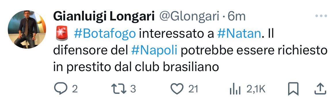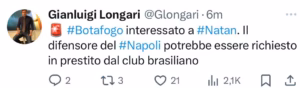 Potrebbe essere terminata, almeno per ora l’avventura di Natan con la maglia del Napoli. Ad un anno dall’arrivo in Italia infatti, il centrale brasiliano potrebbe tornare in patria. Natan infatti secondo quanto riportato in esclusiva dal nostro Gianluigi Longari potrebbe essere richiesto in prestito dal Botafogo.