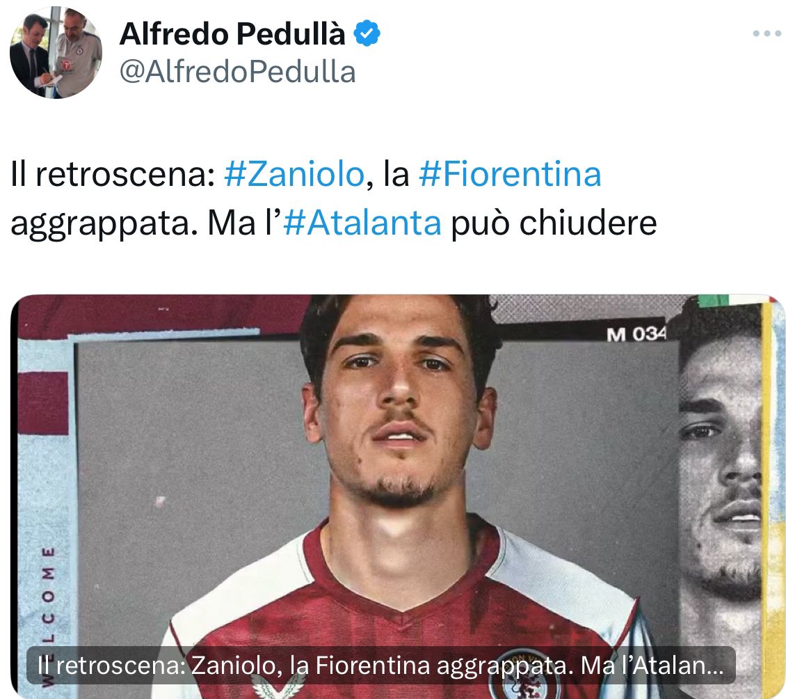 Ecco la news: “Nicolò Zaniolo e il suo futuro: c’è una data chiara, domenica 9 giugno quando per la prima volta – autentica sorpresa – abbiamo accostato il nome dell’esterno offensivo classe 1999 all’Atalanta. Ci sono state conferme su conferme, abbiamo sempre tenuto la Fiorentina è in quota dopo quanto avevamo raccontato già lo scorso gennaio. C’è una differenza: la Fiorentina, che resta aggrappata, lo prenderebbe solo in prestito con diritto di riscatto. Mentre l’Atalanta sta parlando con il Galatasaray su una formula che preveda il trasferimento a titolo definitivo oppure l’obbligo di riscatto. Esiste il via libera di Gasperini che gradisce molto Zaniolo, presto avremo la soluzione definitiva“.