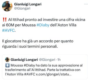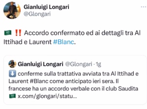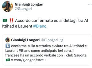 Secondo quanto riportato in esclusiva dal nostro Gianluigi Longari, Laurent Blanc è sempre più vicino a diventare il nuovo allenatore dell’Al Ittihad. Non solo Blanc, la formazione saudita ha ottenuto l’ok di Moussa Diaby. La società saudita cercherà ora l’ok dell’Aston Villa. L’Al Ittihad è pronto ad investire complessivamente 60 milioni di euro. Ecco i tweet: