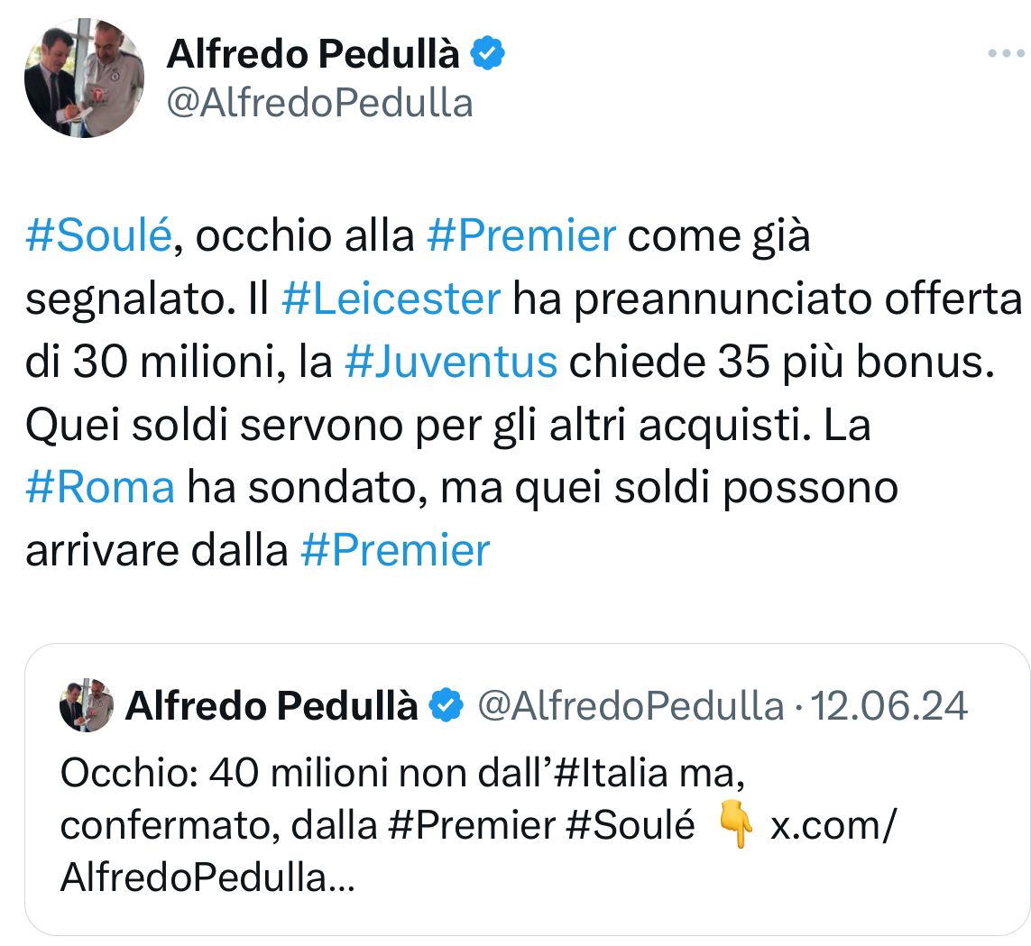 Secondo quanto riportato in esclusiva dal nostro Alfredo Pedullà, l’offerta del Leicester per il cartellino di Soulé sarebbe di 30 milioni di euro. La richiesta della Juventus è invece di 35 milioni + bonus. Soldi che i bianconeri investirebbero negli acquisti. Sul giocatore c’è anche l’interesse della Roma ma a quelle cifre è più probabile il trasferimento in Premier League. Ecco il tweet: