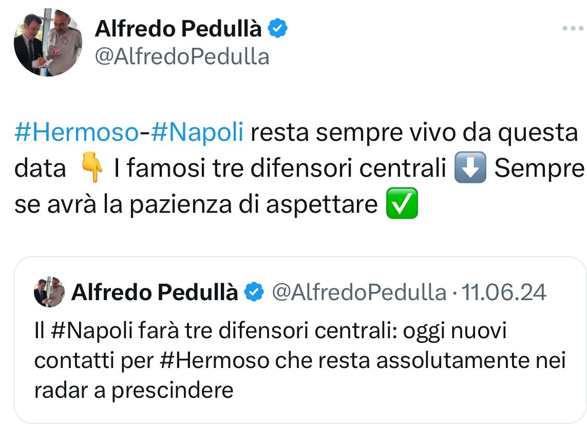 Secondo quanto riportato in esclusiva dal nostro Alfredo Pedullà, l’idea Hermoso è sempre viva in casa Napoli dall’11 giugno. Gli azzurri vogliono fare 3 difensori e due, Rafa Marin e Buongiorno sono già arrivati. Ecco il tweet:
