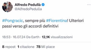 Secondo quanto riportato in esclusiva dal nostro Alfredo Pedullà, Marin Pongracic sarebbe sempre più vicino alla Fiorentina. Ecco la news: “ll sorpasso sul Rennes è cosa fatta: la Fiorentina è in pole per Marin Pongracic, il difensore classe 1997 in uscita dal Lecce. Dopo la nostra clamorosa indiscrezione di ieri sera, il club viola si sta avvicinando sempre più al centrale croato in uscita dal Lecce. Il club viola pareggerà l’offerta del Rennes di circa 15 milioni e sta definendo i dettagli con Pongracic che ha espresso assoluto gradimento per la Fiorentina. In queste ore sta per essere perfezionato il trasferimento di Milenkovic al Nottingham Forest, un’altra nostra esclusiva di ieri“.