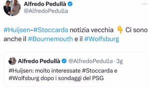 Home » Calcio » Esclusiva SI Juventus, tre club su HuijsenEsclusiva SI Juventus, tre club su Huijsen 23/07/2024 - 23:04 di Carlo Pozzoli Secondo quanto riportato in esclusiva dal nostro Alfredo Pedullà, non solo lo Stoccarda, anche Wolfsburg e Bournemouth sarebbero interessate a Dean Huijsen, difensore della Juventus. Ecco il tweet: