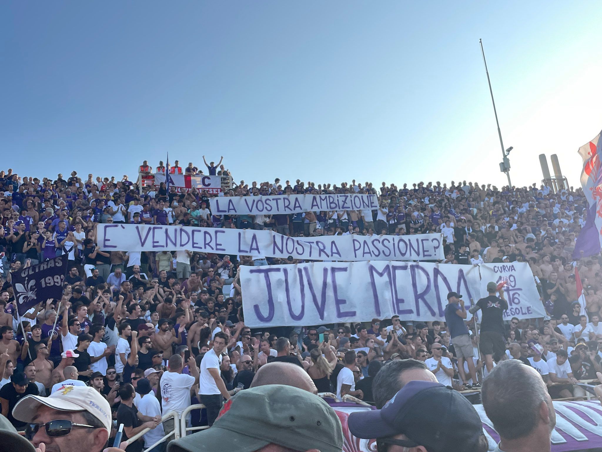 Come riporta il giornalista Matteo Dovellini di Repubblica, allo Stadio Franchi durante la sfida al Venezia è stato esposto un duro striscione della Curva Fiesole nei confronti della società dopo la cessione dell’argentino: “La vostra ambizione è vendere la nostra passione? Juve m***a”.