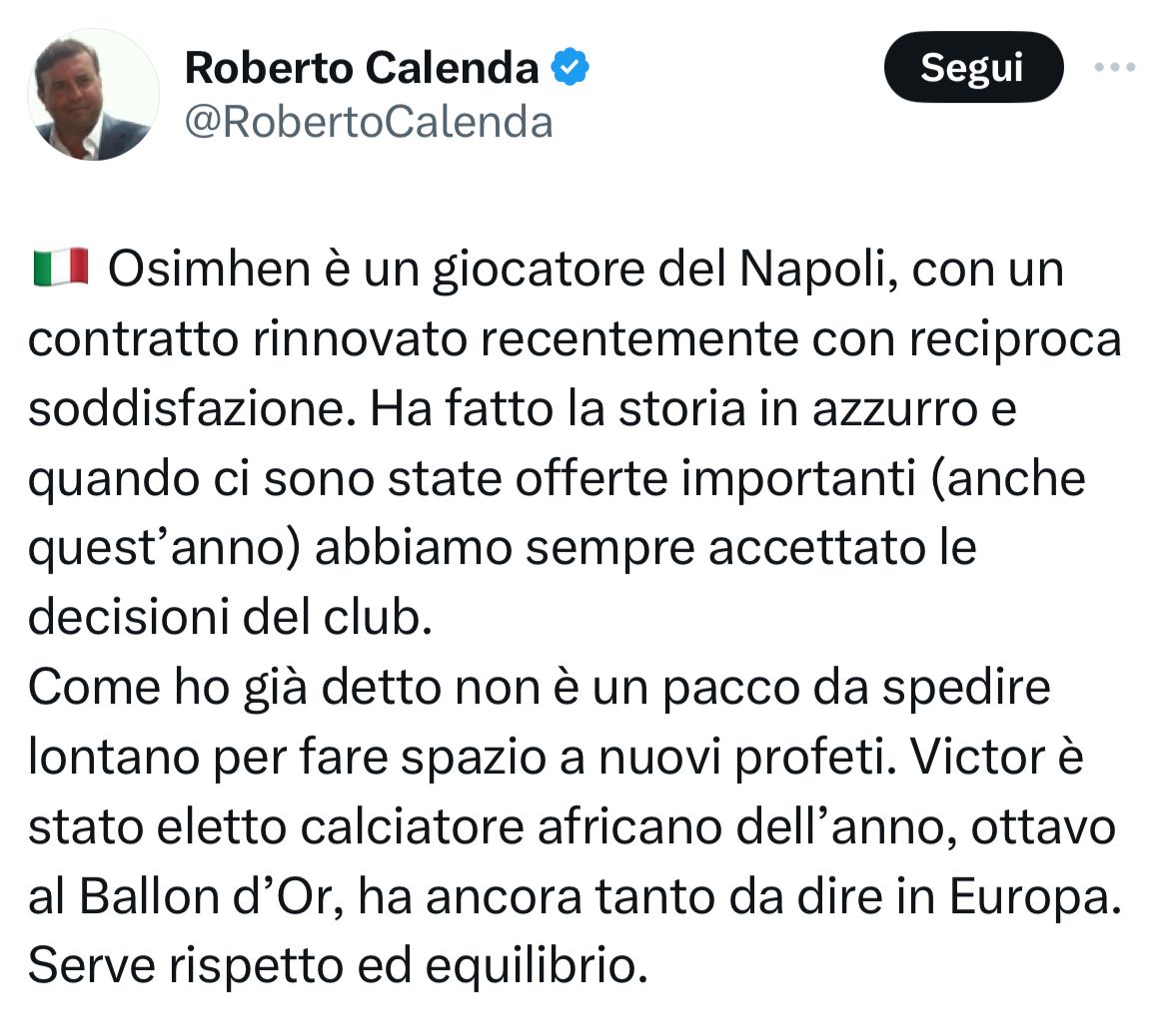 Roberto Calenda, agente di Victor Osimhen, interviene sul suo account X riguardo alla situazione del suo assistito al Napoli.