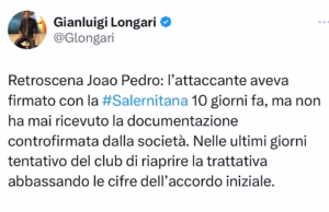 Secondo quanto riportato in esclusiva dal nostro Gianluigi Longari, Joao Pedro aveva firmato con la Salernitana 10 giorni fa, ma non ha mai ricevuto la documentazione controfirmata dalla società. Negli ultimi giorni il tentativo del club di riaprire la trattativa abbassando le cifre dell’accordo iniziale non è bastato.