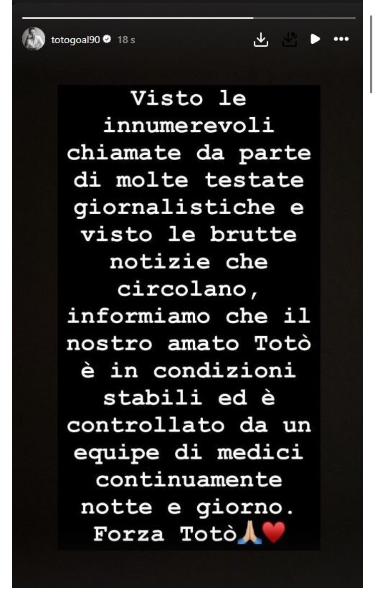 Tramite una storia su Instagram attraversi il profilo di Totò Schillaci, la famiglia rassicura sulle condizioni dell’eroe di Italia 90. Ecco il testo del post: “Visto le innumerevoli chiamate da parte di molte testate giornalistiche e visto le brutte notizie che circolano, informiamo che il nostro amato Totò è in condizioni stabili ed è controllato da un equipe di medici continuamente notte e giorno. Forza Totò“.