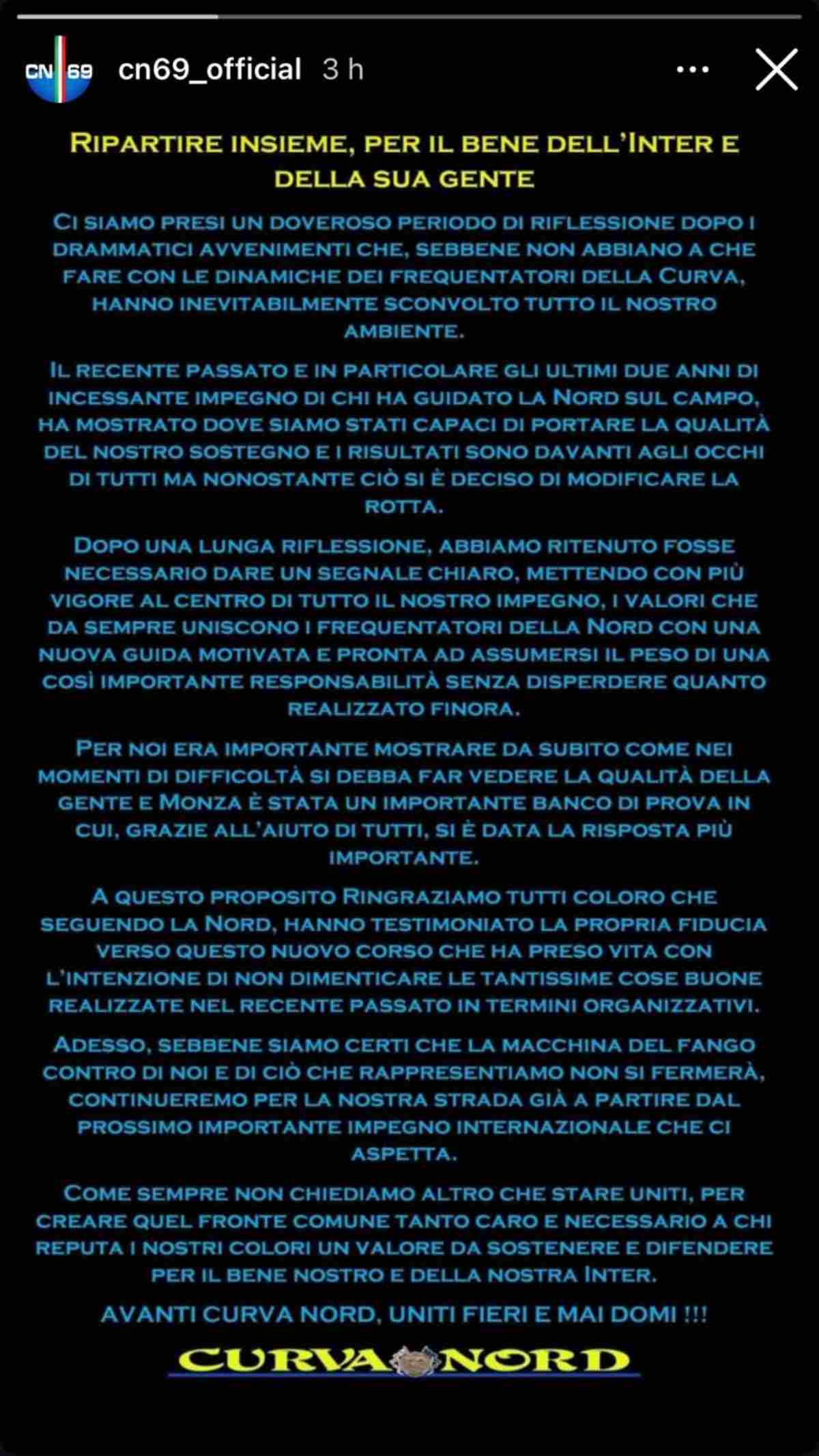 Home » Calcio » Inter, la carica della Curva Nord: “Ripartire insieme, per il bene dell’Inter e della sua gente”Inter, la carica della Curva Nord: “Ripartire insieme, per il bene dell’Inter e della sua gente” 17 Settembre 2024 di Massimiliano Fina