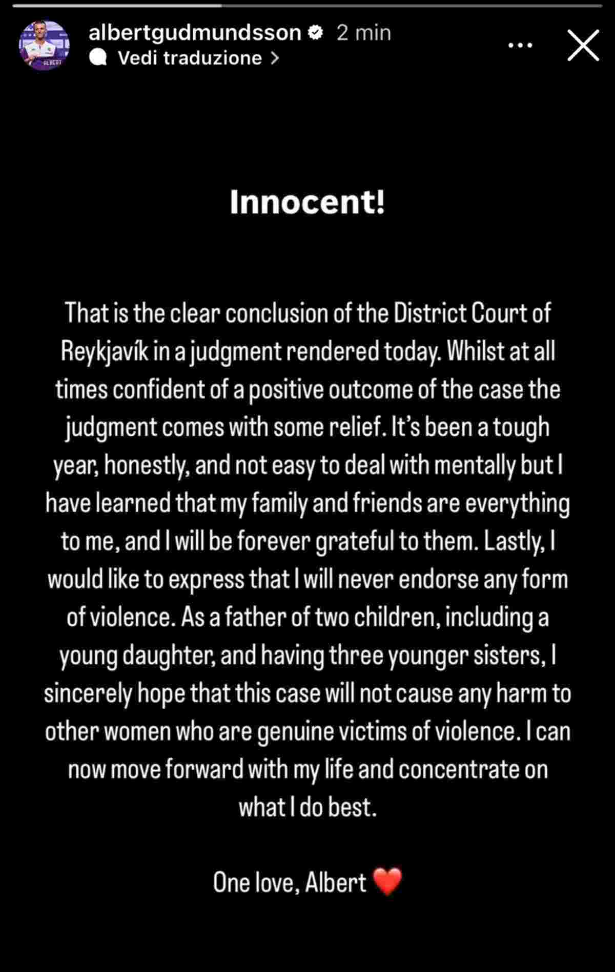 Questa è la chiara conclusione della Corte distrettuale di Reykjavik nella sentenza resa oggi. Pur essendo sempre fiduciosi in un esito positivo del caso, la sentenza arriva con un certo sollievo. È stato un anno difficile, onestamente, e non facile da affrontare mentalmente, ma ho imparato che la mia famiglia e i miei amici sono tutto per me e sarò loro per sempre grato. Infine, vorrei esprimere che non appoggerò mai alcuna forma di violenza. Come padre di due figli, tra cui una figlia piccola, e con tre sorelle più giovani, spero sinceramente che questo caso non causi alcun danno ad altre donne che sono vere vittime di violenza. Ora posso andare avanti con la mia vita e concentrarmi su ciò che so fare meglio. Un amore, Albert”.