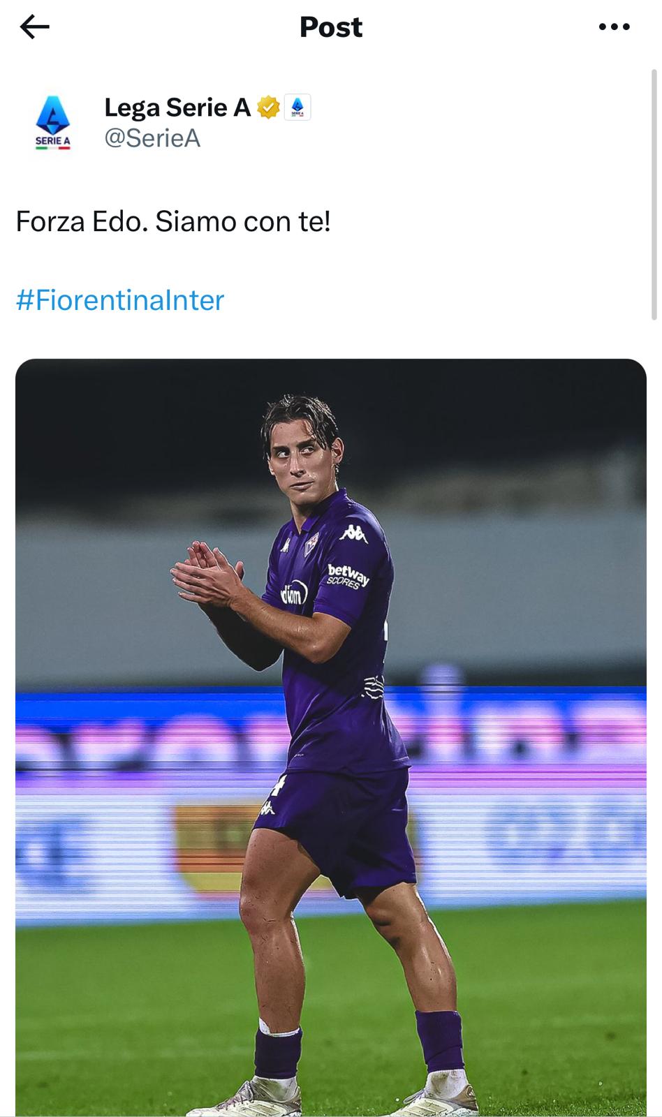 Edoardo Bove si è accasciato al suolo durante Fiorentina-Inter, con la partita che è stata sospesa e rinviata a data da definire. Arriva ora il messaggio di supporto della Lega Serie A al giocatore viola, che si trova in ospedale.