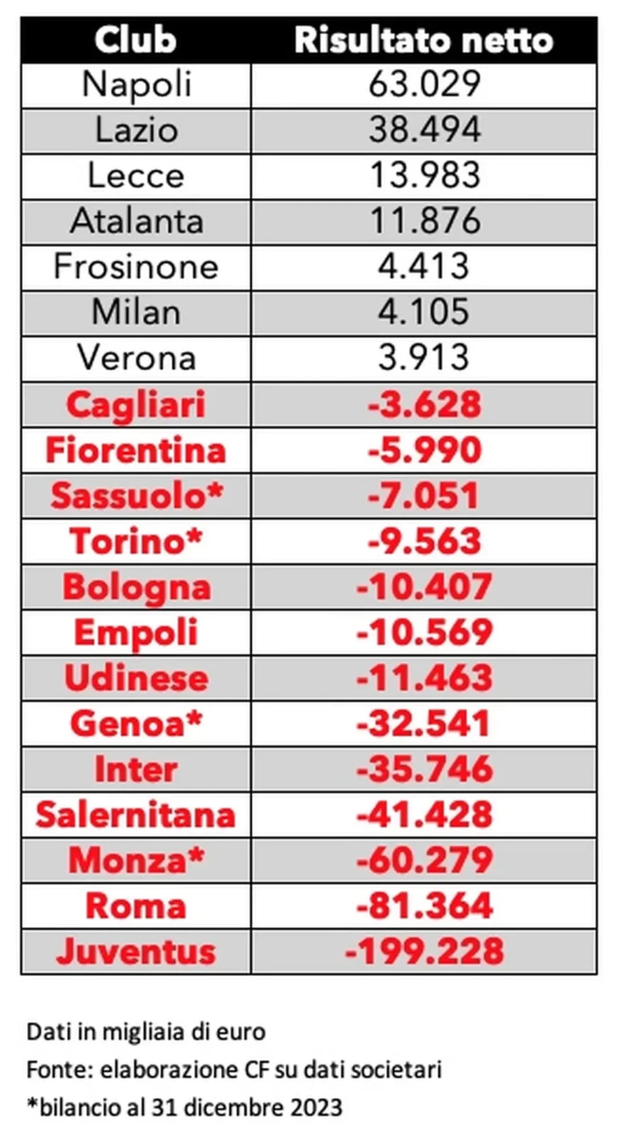 A proposito di rosso: sapete su 20 club quanti hanno il bilancio ufficiale stagione 2023/2024 in negativo? 13, tipo Juve, Inter, Fiorentina, Udinese, Bologna, Roma tra le altre). Dunque se la matematica non è un’opinione, solo 7 sono riusciti a mantenerlo “sano” e di questi l’attenzione va sull’US Lecce, perché è un anno in cui la società del patron Sticchi vuole scrivere la storia, come si fa in Salento da quando si è insediato nel club della sua terra.