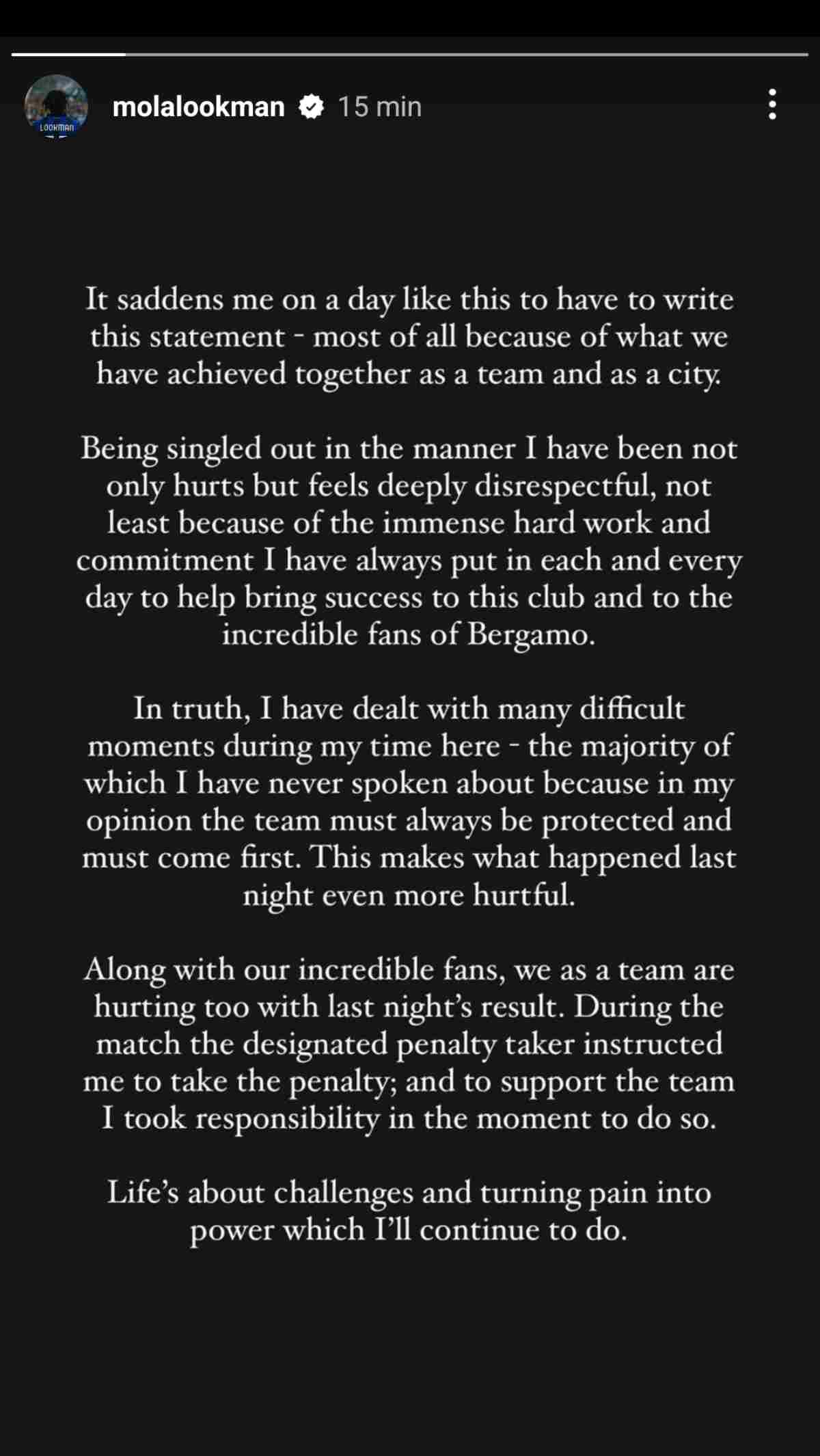 Lookman ha voluto anche aggiungere che chi doveva calciare il rigore gli ha ceduto il pallone: “Durante la partita il rigorista designato mi ha ordinato di tirare il rigore; e per supportare la squadra mi sono assunto la responsabilità di farlo in quel momento. La vita è fatta di sfide e di trasformare il dolore in potere, cosa che continuerò a fare”.